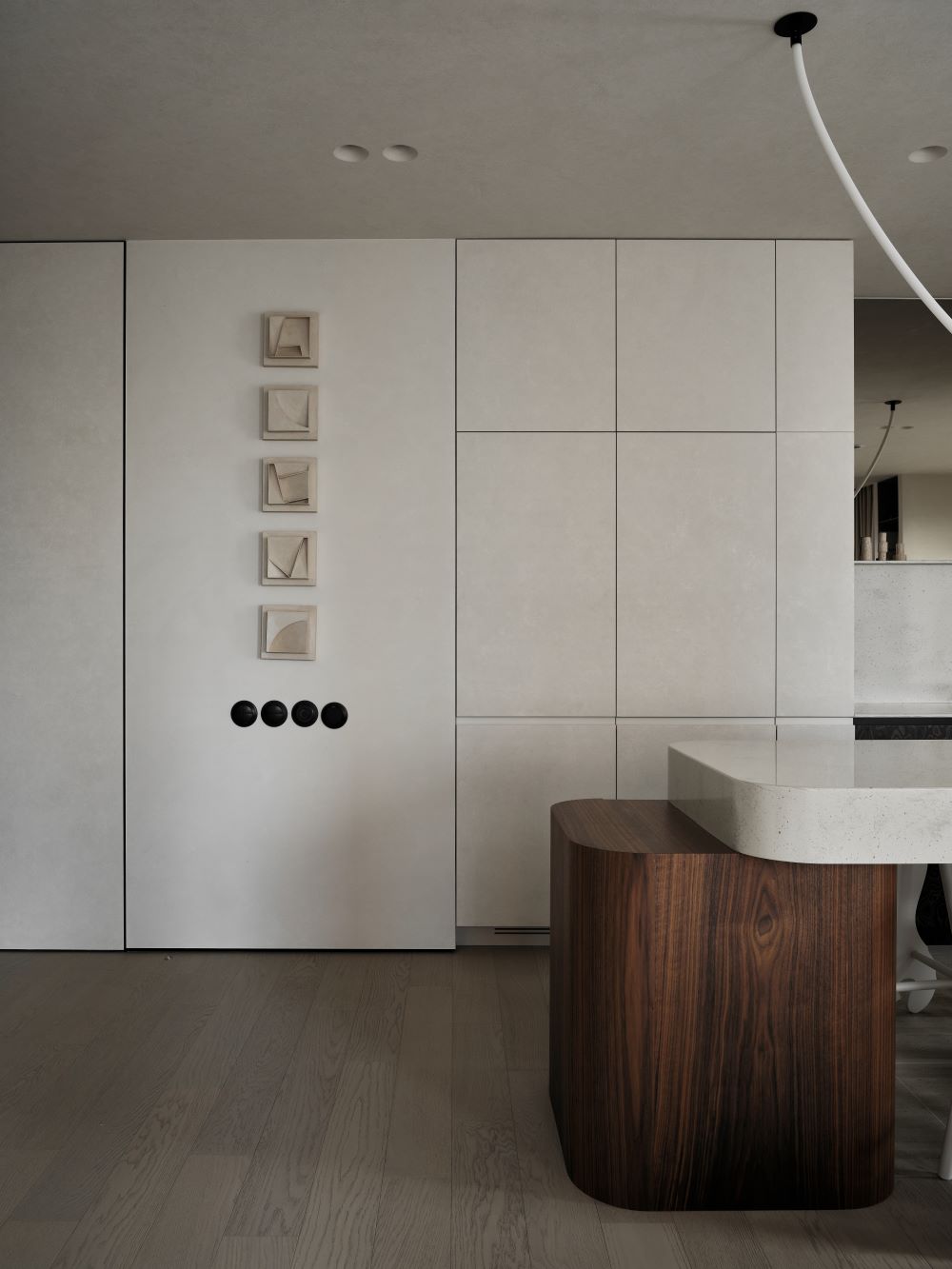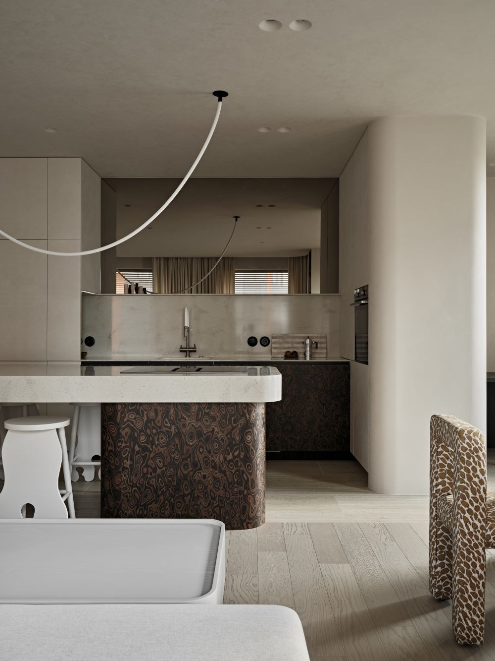 Основная задача — сохранить планировку, но полностью изменить ощущение пространства с помощью мягкой геометрии, продуманного света и правильных материалов.