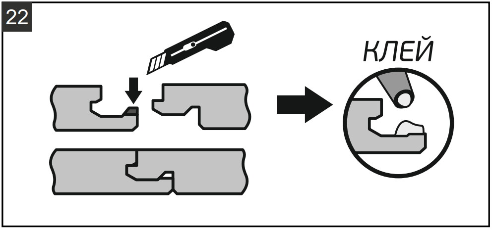 10.7. В этом случае необходимо убрать часть замка и нанести клей, как показано на рис. 22. Нанесите клей на выступ замка.